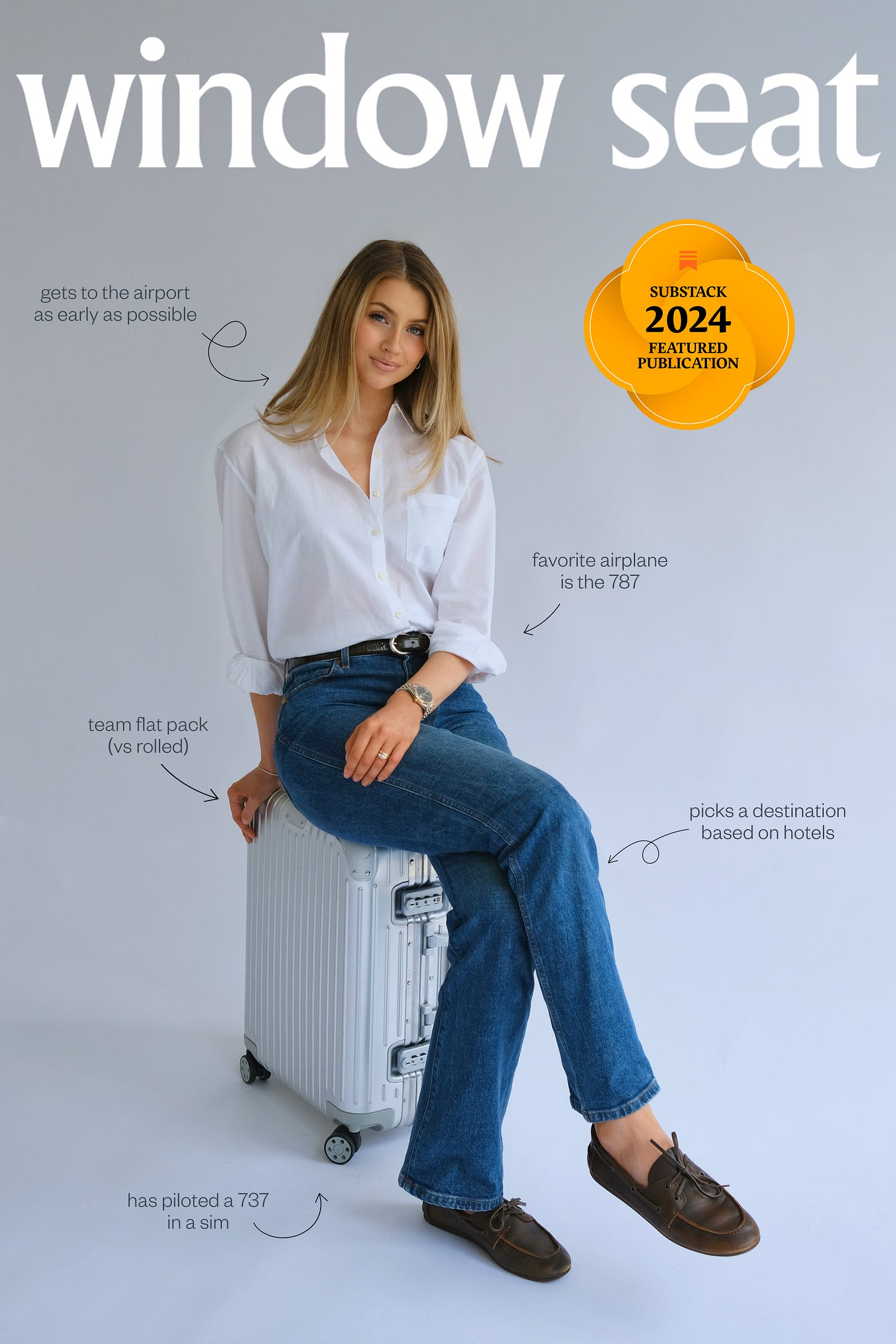 Today, she writes Window Seat, a bestselling Substack newsletter that transformed that once-paralyzing fear into a career. Equal parts editorial and essential, it is read by thousands of travelers, tastemakers, and curious minds who care as much about how they travel as where they go. From packing rituals and aviation lore to atmospheric stays and interviews with creative people, it’s a love letter to forward motion and a guide to traveling well.