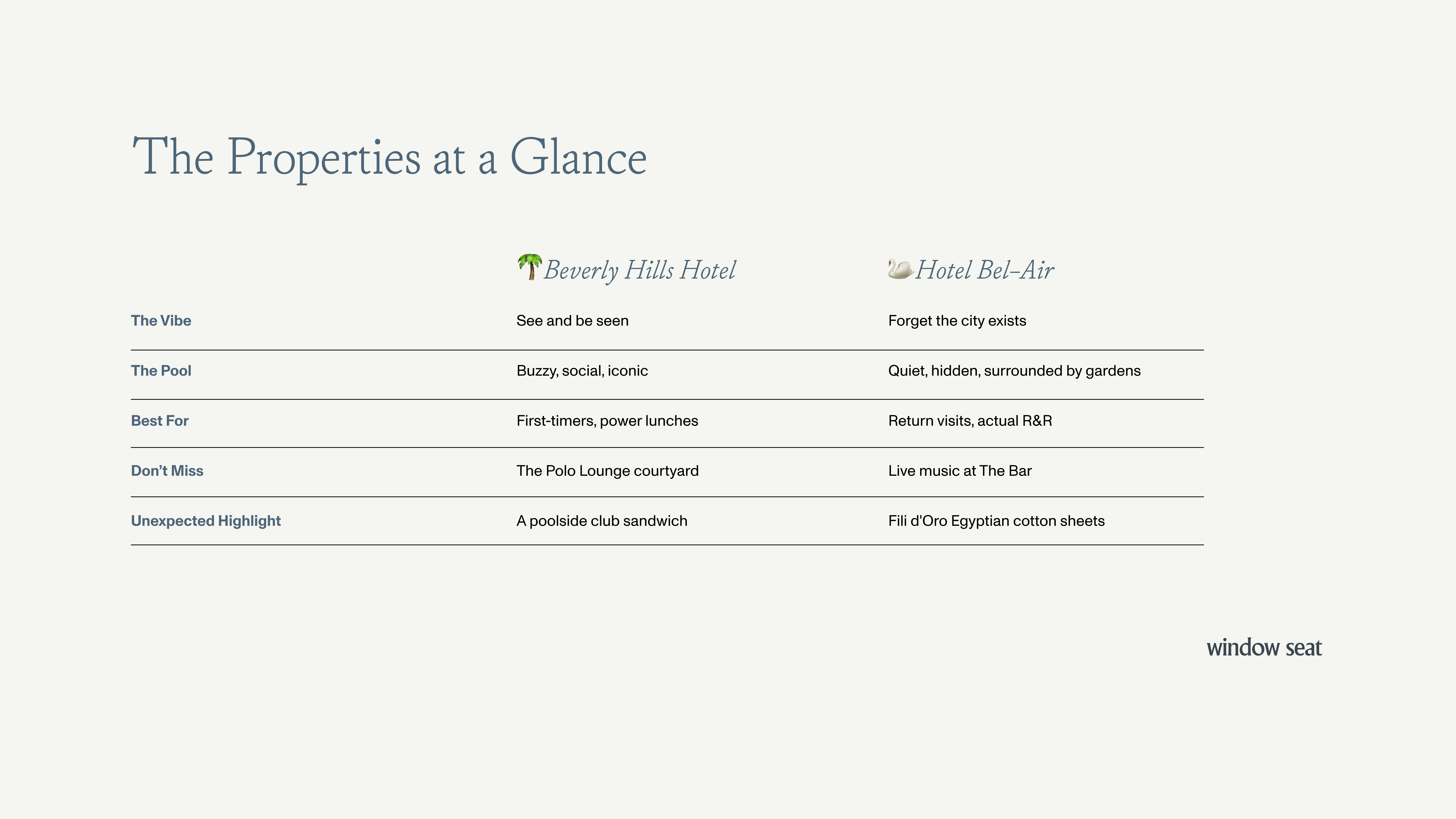 Both are part of the Dorchester Collection: one of the most selective luxury hotel groups in the world, with just over a dozen properties chosen for cultural significance and individual character rather than scalability. You’ll find them in London, Paris, Milan, Rome, Dubai. And in the United States, there’s just two: both in Los Angeles, both on my itinerary. Beyond their shared collection, the two properties have almost nothing in common, which is exactly why staying at both, back to back, is such a revealing exercise in understanding what luxury actually means to you.