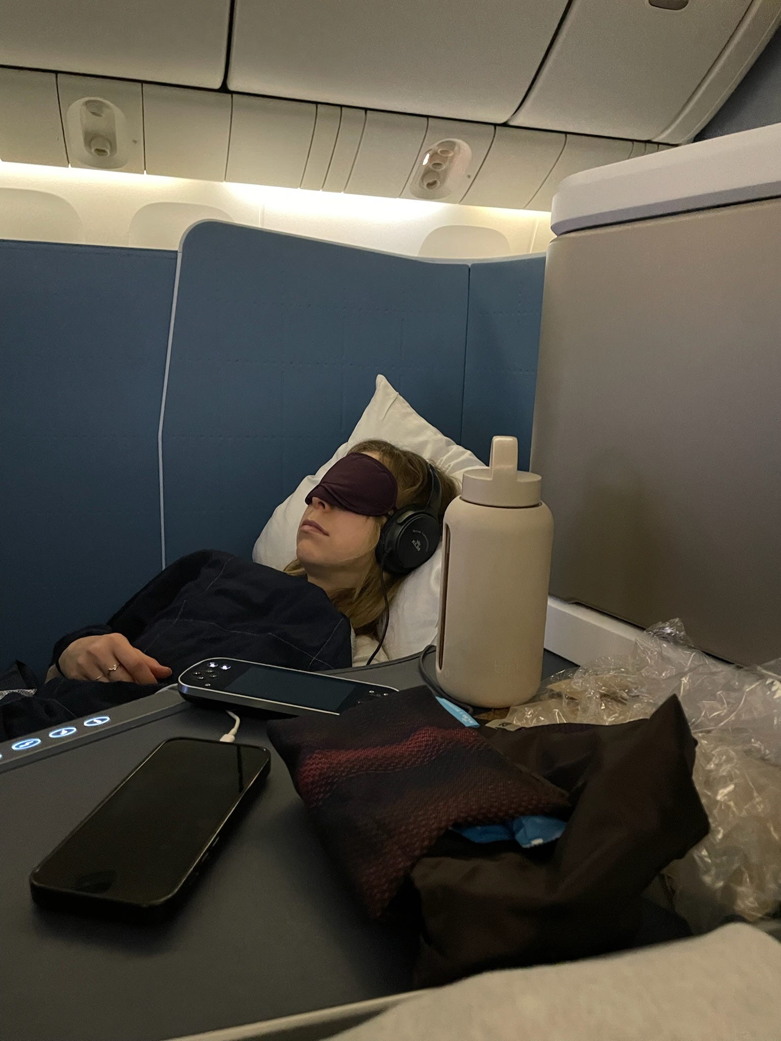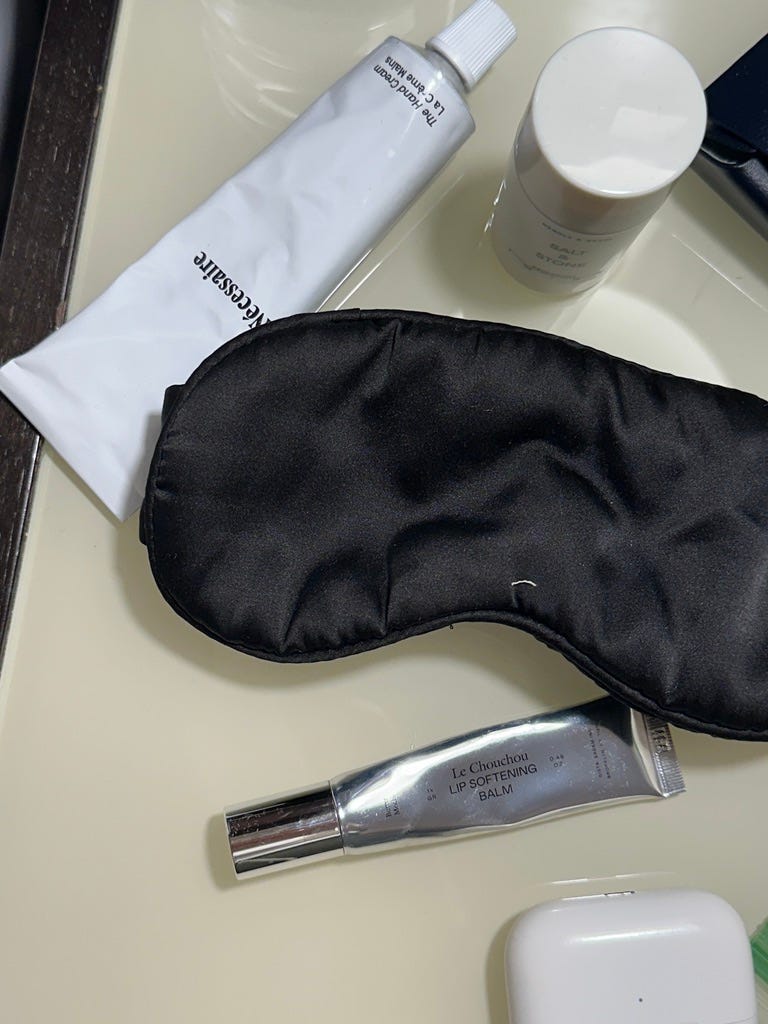 Right after boarding, I take a couple of melatonin gummies and mix magnesium powder into some water to help my body start winding down. By the time I’m ready to sleep, I pull out my two non-negotiables: a good sleep mask and quality earplugs. Together, they create a near-total, blissful blackout.