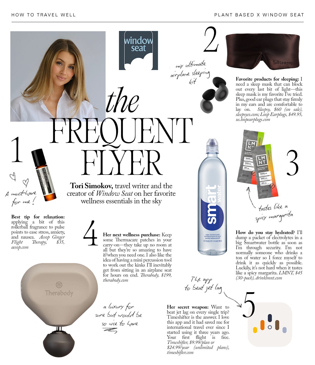 TS: For years, I was deathly afraid of flying, so I deeply understand the anxiety that flying can trigger. I’ve managed to overcome my own fear using a handful of tools and rituals that help ground me in the air.
