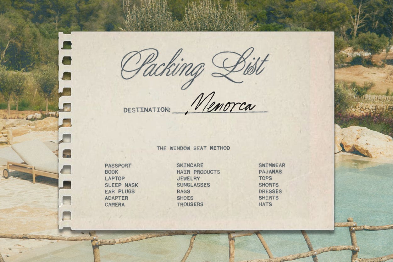 To shape my vacation wardrobe, I visualize specific moments of the trip and build outfits around each. It’s how I avoid overpacking, keep my pre-trip anxiety low (no panic packing here), and turn packing into a ritual I actually look forward to. In today’s post, I’m giving you a peek into that process with five fully styled looks built around actual stops on my Menorcan getaway, from my flight-day fit to my poolside lounging look. You’ll get a glimpse at what’s in my suitcase and on my itinerary.