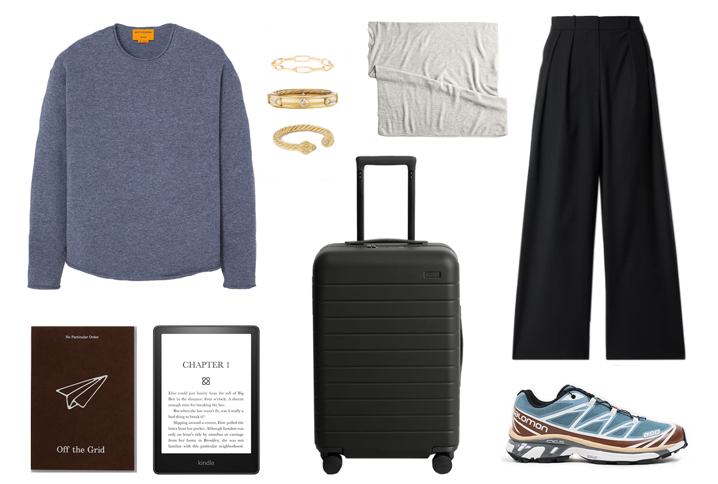 Any form of pleated pants (these strike a good balance of being comfortable and looking somewhat put together), a cashmere crew, and sneakers. I also love traveling with a big scarf as a chicer and dual-purpose alternative to a neck rest.