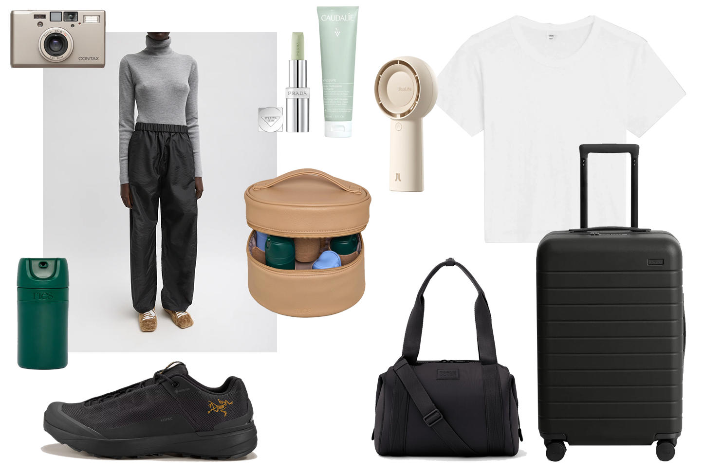 I’ve carried my Dagne Dover Medium Landon as my go-to carry-on bag for years. It’s truly magic and can hold an insane amount without becoming roughed up. I always bring some essentials to keep me hydrated: a lightweight reusable water bottle, LMNT electrolytes in watermelon salt, hand lotion in a Ries bottle and lip balm. I also always have a book, plane headphones, some hand sanitizer and my Contax T3 (which I always make sure to hand check at every TSA to preserve the film!)