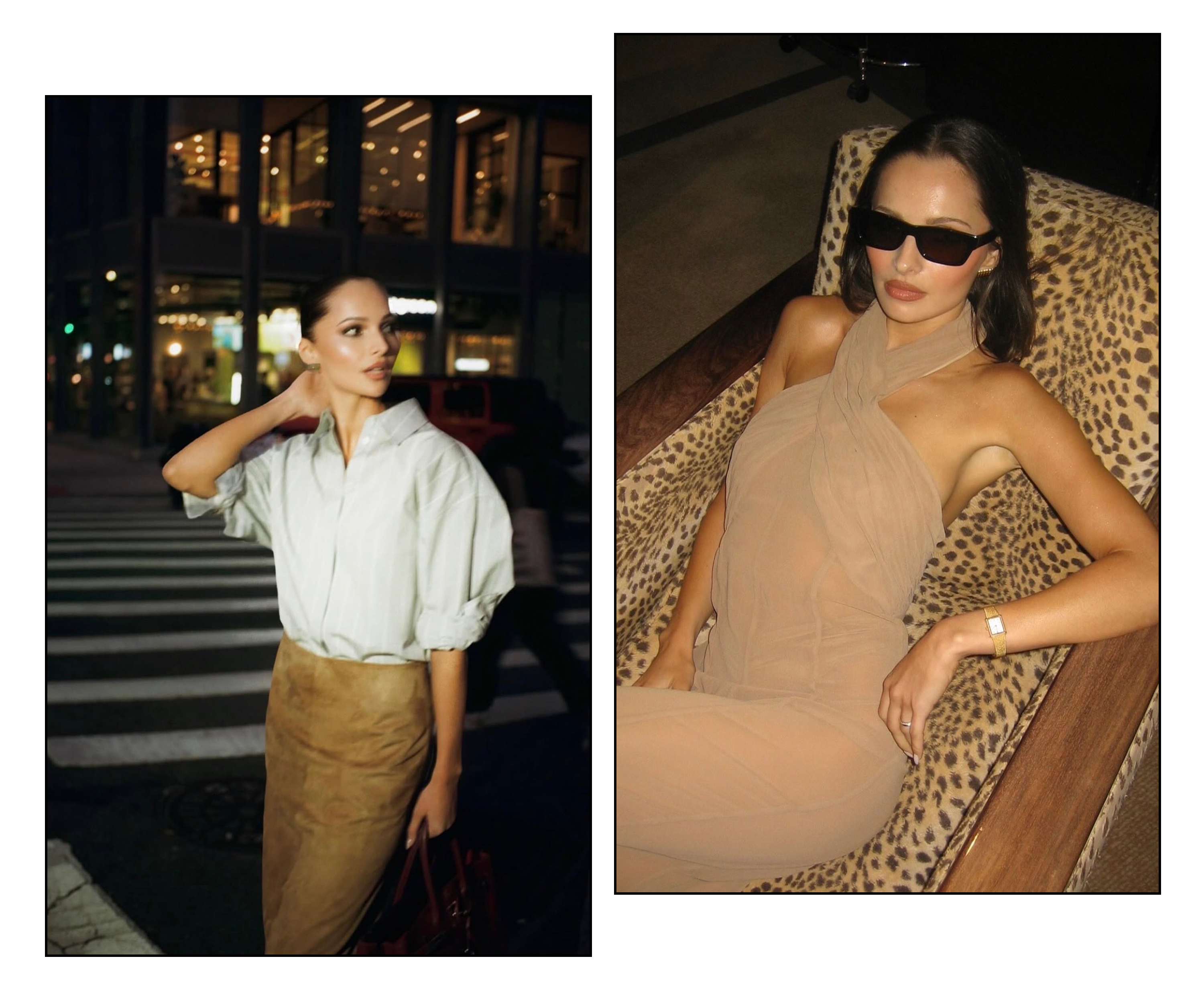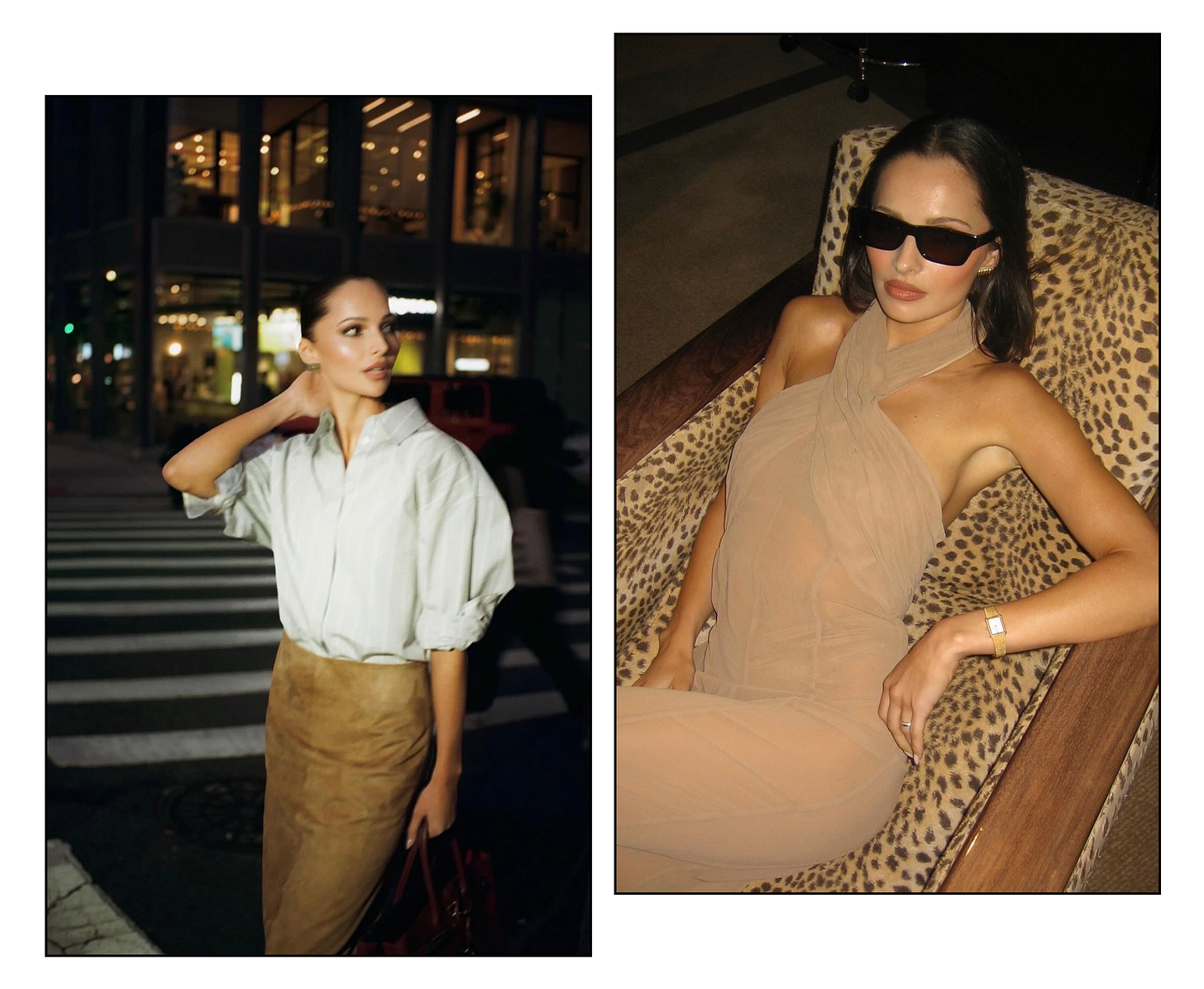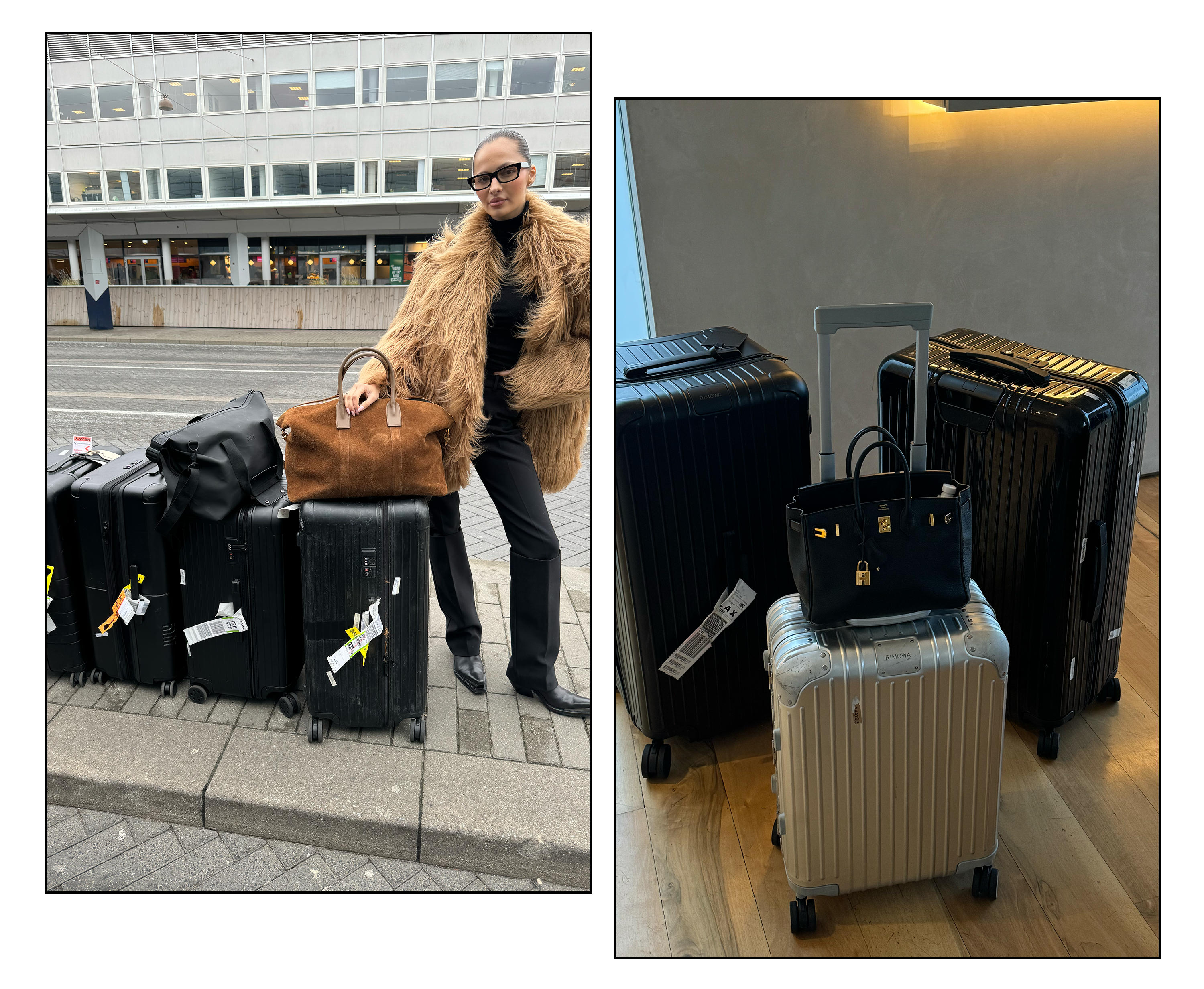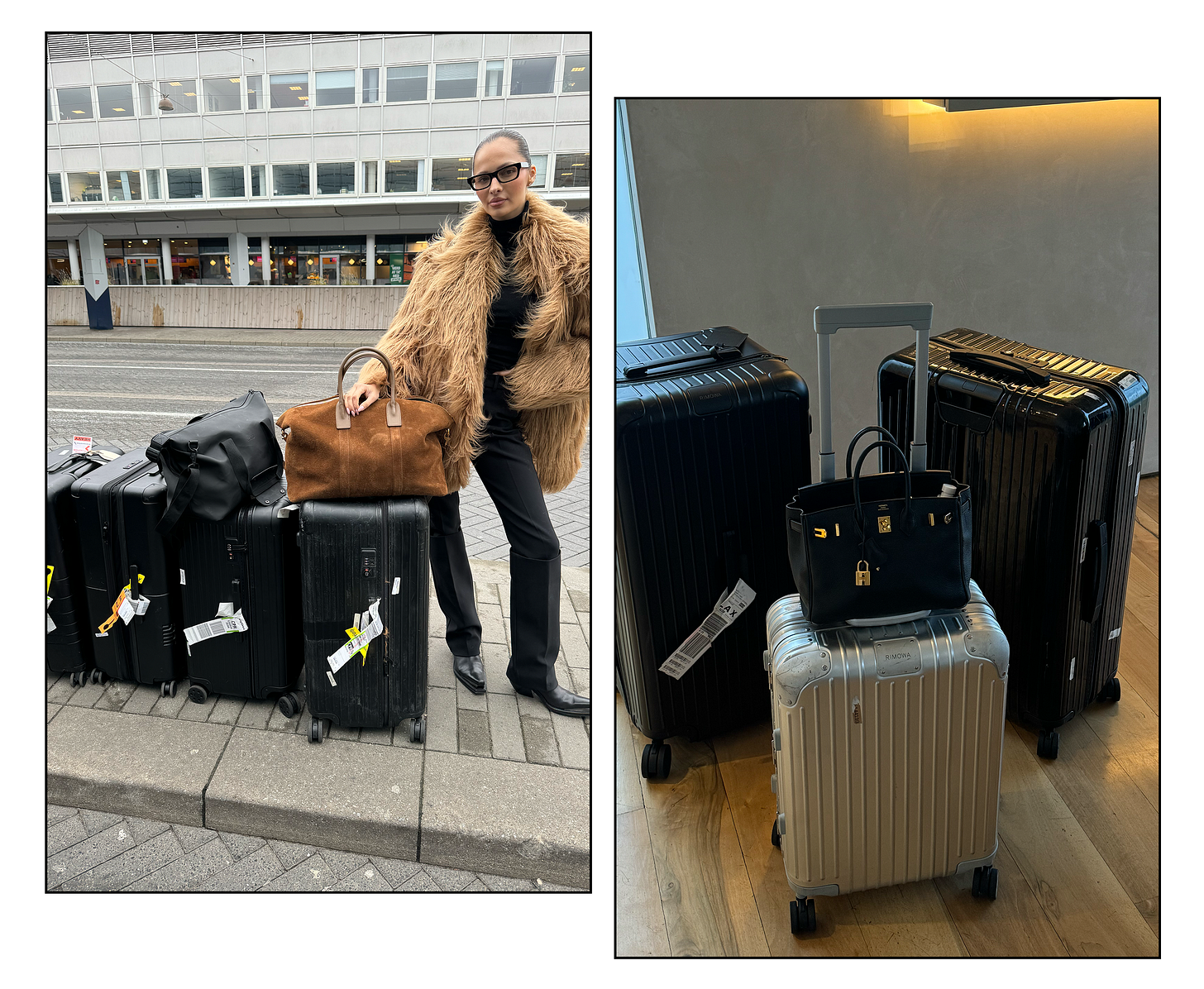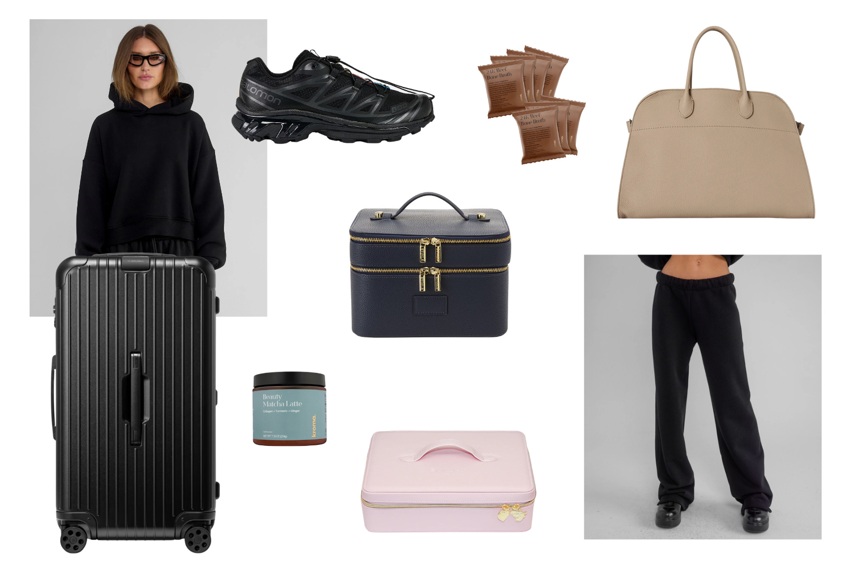 My Black Rimowa Trunks and Carry-on come with me on every trip. Packing everything in packing cubes is the true travel game changer; it keeps everything neat and organized. I pack all my Kroma products to make sure there’s always something delicious with me. I also love using my Etoile and Emi Jay toiletries cases for all skincare and makeup. On the plane, I can’t travel without lip balm, a hair brush, and compression socks. Of course, it’s nice to do the face masks and make it a whole experience, but my non-negotiables are those three.