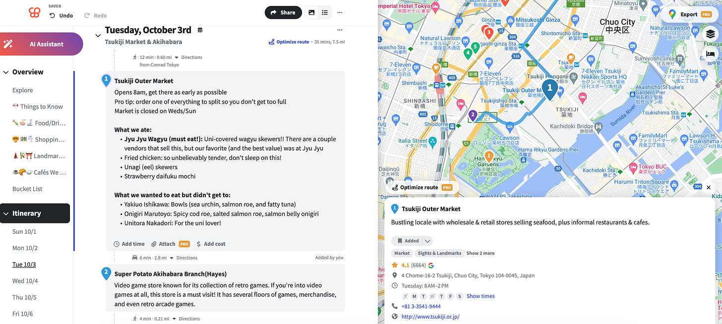 During my trip to Japan, I used it to group together activities/sights that were near each other to maximize what I was able to see and do. In the above screenshot, you can see a couple spots I added to the itinerary (along with my own notes); in between each, Wanderlog automatically adds the transport time between each and picks the transport method (walking, driving) that makes the most sense. It also adds all of the details related to your itinerary items, as shown on the right-hand side of the screenshot, where I’ve expanded the info for Tsukiji Outer Market. It’s this kind of stuff that makes this tool immensely helpful.