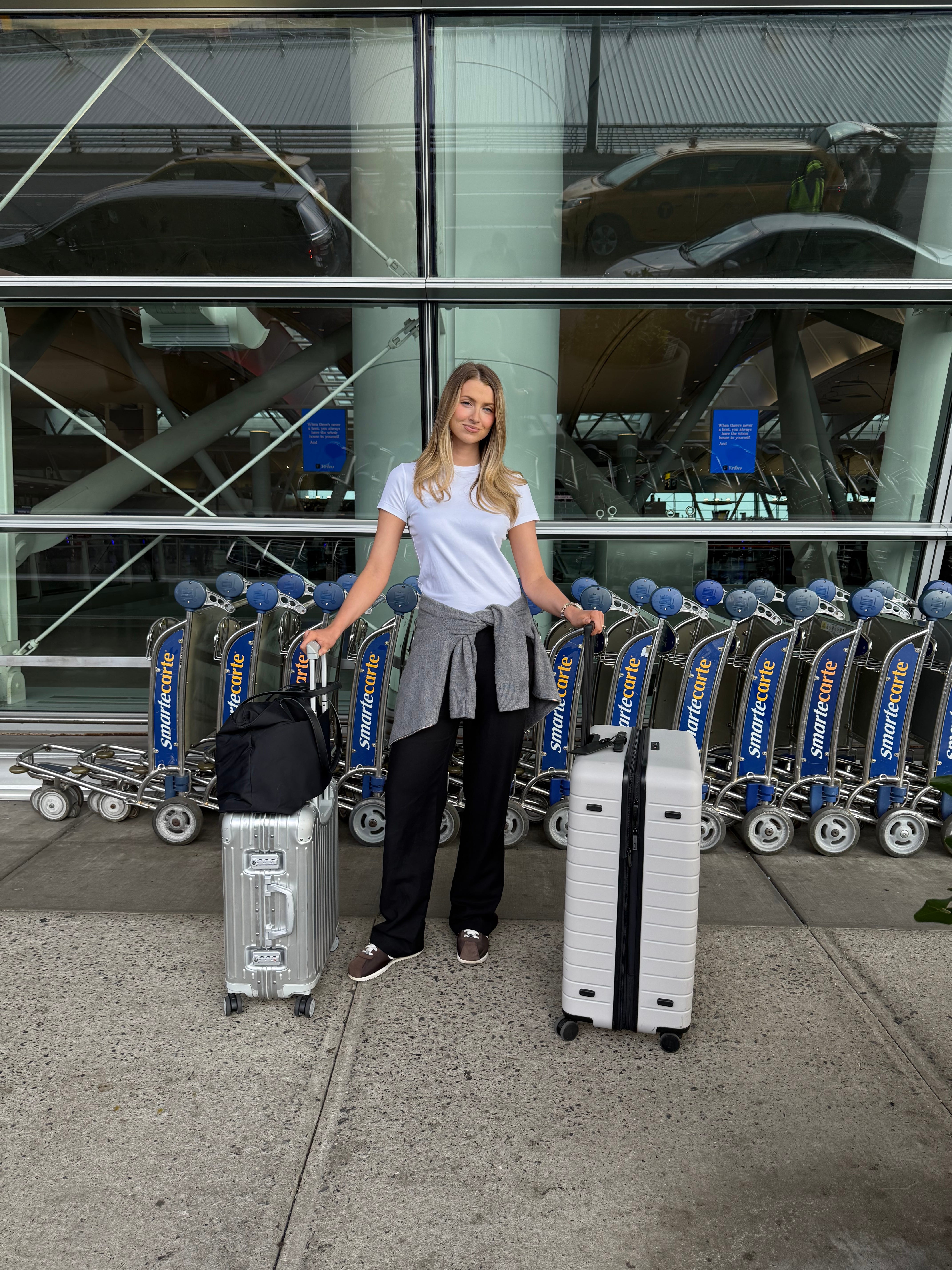 My favorite travel outfit will always be a variation of this formula: comfy pants that read chic + slim fit tee or tank + sweater + low-profile sneaker. For t-shirts, I—no joke—own five of these because they’re so good (and affordable). I don’t like being without one if I have some in the wash or I stain one. I always bring a sweater because, duh, planes are cold. Recently, this wool zip-up has been my go-to, but I also like this pullover. I have yet to find pants I like better for travel than the aptly-named Everywhere Pant, and I have worn these sneakers on every single flight for a year now.