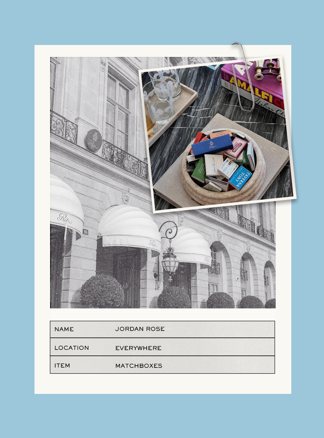 An archive of good times: Matchbooks, postcards, and hotel stationery are my go-to souvenirs—tiny, packable, and instantly nostalgic. They hint at where you’ve been and, depending on the wear and tear, how long you’ve loved them. They also make the best conversation starters when scattered around the house.