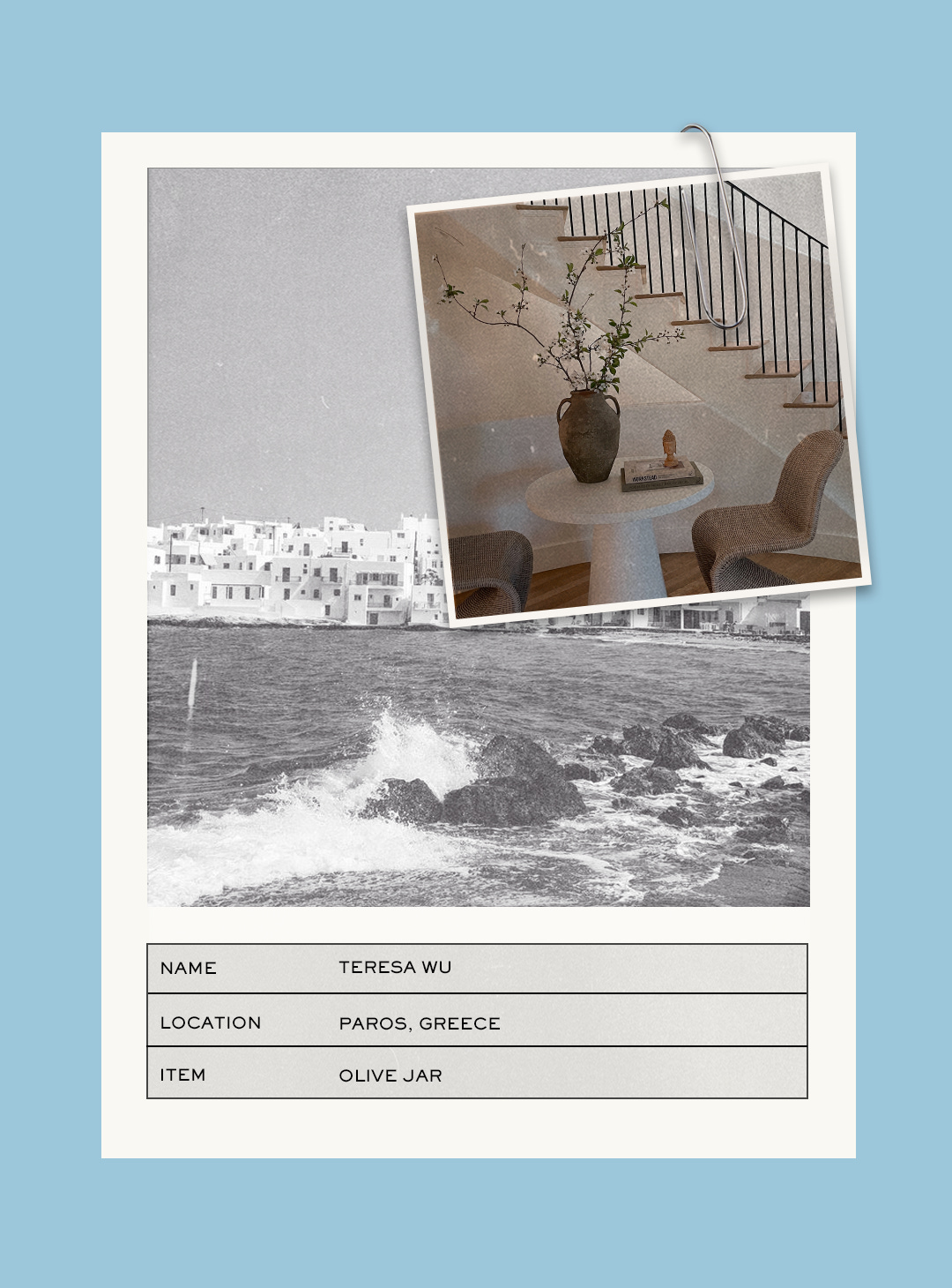 A roadside relic: Heading to the port in Paros in our beater of a rental car, I spotted a roadside antique store with marble sinks, huge vases, and old doors outside of it. Despite running late, we pulled over because I'm a sucker for a shop full of old treasures. Among all the found objects was the perfect olive jar, priced just right at <60 euros. I asked the shop owner if there was any chance he could ship, but he clearly could not be bothered.