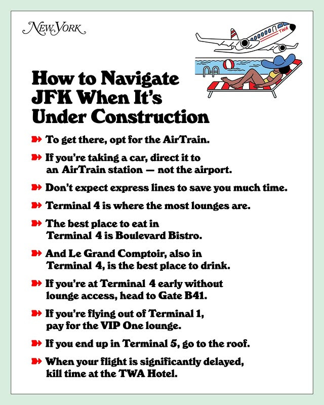 For anyone flying in or out of NYC, you probably already know: JFK is a bit of a nightmare right now. I loved this clever graphic NY Mag published with some genuinely helpful navigation tips. And if you’re passing through Terminal 4 and need a place to recharge, my lounge pick might surprise you: Capital One. It has way better vibes than Chase Sapphire (tiny, cramped) and Amex Centurion (giving dungeon). And if you really have time to kill, the TWA Hotel is incredible. It’s worth even just a walkthrough—take my word for it!