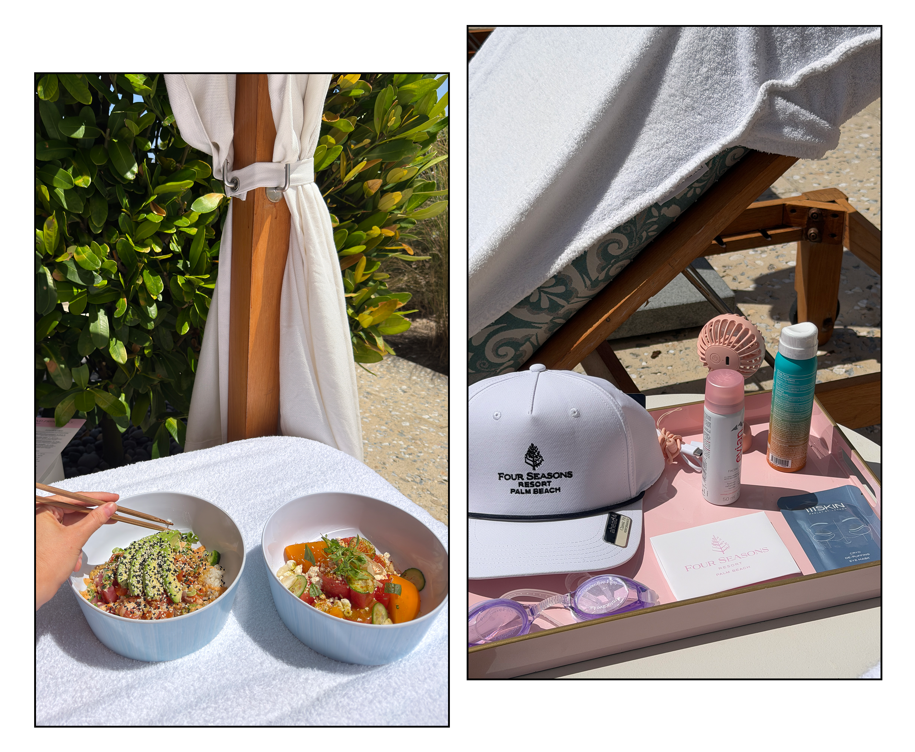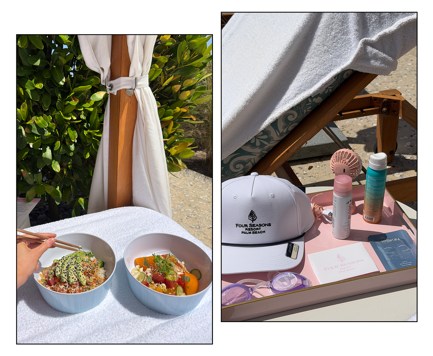 Speaking of poolside: I was brought a tray of complimentary amenities shortly after settling in: a personal fan, face mist, undereye patches, sunscreen, goggles, a sunglass cleaning cloth, and a Four Seasons hat. Sounds like a small gesture until you're actually sitting outside in the Florida sun and realize someone thought of everything before you did. This is the kind of thing I mean when I say anticipatory service (the best kind).